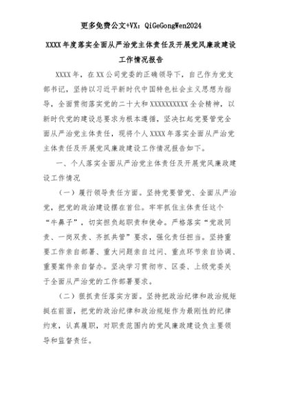 【七哥公文】2025年:XXXX年度落实全面从严治党主体责任及开展党风廉政建设工作情况报告+更多免费公文+VX:QiGeGongWen2024+更多免费公文+VX:QiGeGongWen2024