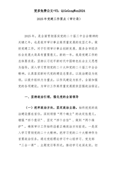 【七哥公文】2025年:2025年党建工作要点(审计局)+更多免费公文+VX:QiGeGongWen2024+更多免费公文+VX:QiGeGongWen2024