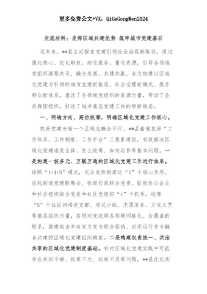 【七哥公文】2025年:交流材料:发挥区域共建优势 筑牢城市党建基石+更多免费公文+VX:QiGeGongWen2024+更多免费公文+VX:QiGeGongWen2024