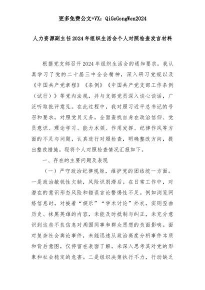 【七哥公文】2025年:人力资源副主任2024年组织生活会个人对照检查发言材料+更多免费公文+VX:QiGeGongWen2024+更多免费公文+VX:QiGeGongWen2024