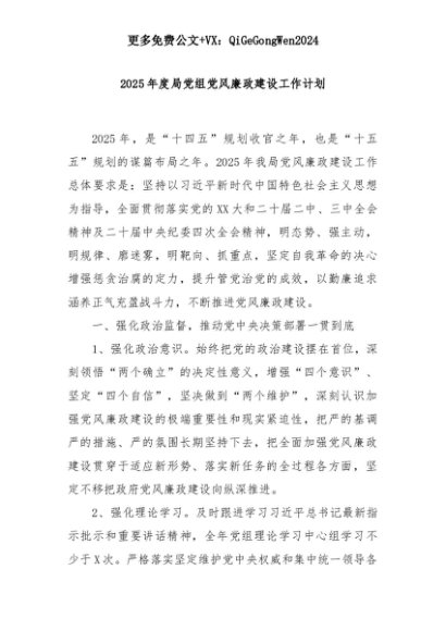 【七哥公文】2025年:2025年度局党组党风廉政建设工作计划+更多免费公文+VX:QiGeGongWen2024+更多免费公文+VX:QiGeGongWen2024