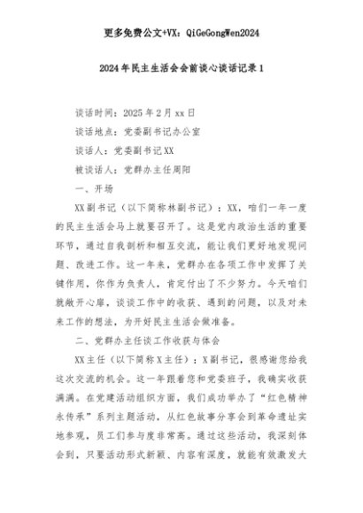 【七哥公文】2025年:2024年民主生活会会前谈心谈话记录1+更多免费公文+VX:QiGeGongWen2024+更多免费公文+VX:QiGeGongWen2024