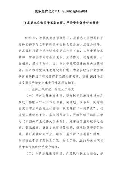 【七哥公文】2025年:XX县委办公室关于落实全面从严治党主体责任的报告+更多免费公文+VX:QiGeGongWen2024+更多免费公文+VX:QiGeGongWen2024