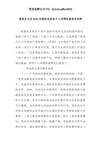 【七哥公文】2025年:党政办主任2024年组织生活会个人对照检查发言材料+更多免费公文+VX:QiGeGongWen2024+更多免费公文+VX:QiGeGongWen2024