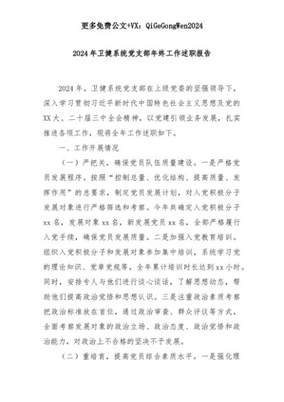 【七哥公文】2025年:2024年卫健系统党支部年终工作述职报告+更多免费公文+VX:QiGeGongWen2024+更多免费公文+VX:QiGeGongWen2024