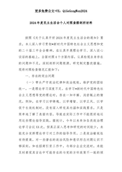 【七哥公文】2025年:2024年度民主生活会个人对照查摆剖析材料+更多免费公文+VX:QiGeGongWen2024+更多免费公文+VX:QiGeGongWen2024