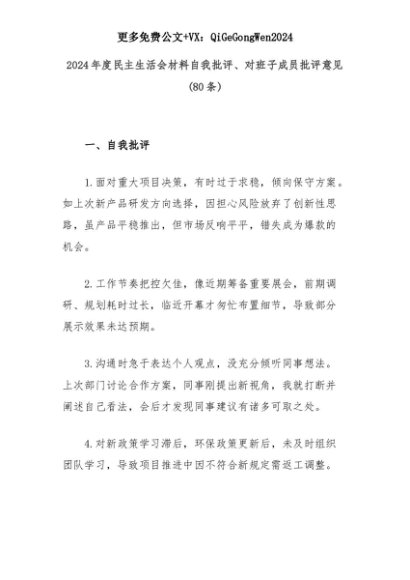 【七哥公文】2025年:(80条)2024年度民主生活会材料自我批评、对班子成员批评意见+更多免费公文+VX:QiGeGongWen2024+更多免费公文+VX:QiGeGongWen2024