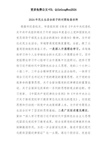 【七哥公文】2025年:2024年民主生活会班子的对照检查材料+更多免费公文+VX:QiGeGongWen2024+更多免费公文+VX:QiGeGongWen2024