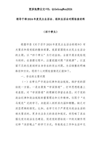 【七哥公文】2025年:领导干部2024年度民主生活会、组织生活会对照检查材料(四个带头)+更多免费公文+VX:QiGeGongWen2024+更多免费公文+VX:QiGeGongWen2024