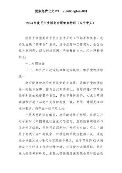 【七哥公文】2025年:2024年度民主生活会对照检查材料(四个带头)+更多免费公文+VX:QiGeGongWen2024+更多免费公文+VX:QiGeGongWen2024