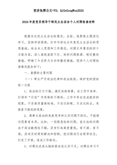 【七哥公文】2025年:2024年度党员领导干部民主生活会个人对照检查材料+更多免费公文+VX:QiGeGongWen2024+更多免费公文+VX:QiGeGongWen2024