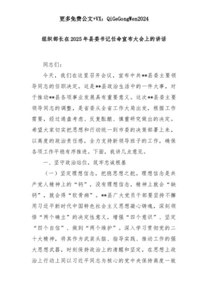 【七哥公文】2025年:组织部长在2025年县委书记任命宣布大会上的讲话+更多免费公文+VX:QiGeGongWen2024+更多免费公文+VX:QiGeGongWen2024