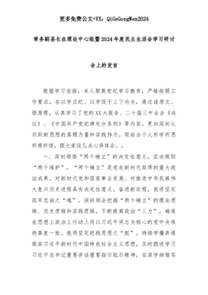 【七哥公文】2025年:常务副县长在理论中心组暨2024年度民主生活会学习研讨会上的发言+更多免费公文+VX:QiGeGongWen2024+更多免费公文+VX:QiGeGongWen2024