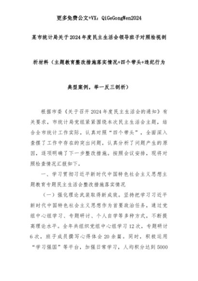 【七哥公文】2025年:某市统计局关于2024年度民主生活会领导班子对照检视剖析材料(主题教育整改措施落实情况+四个带头+违纪行为典型案例,举一反三剖析)+更多免费公文+VX:QiGeGongWen2024+更多免费公文+VX:QiGeGongWen2024