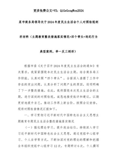 【七哥公文】2025年:某市商务局领导关于2024年度民主生活会个人对照检视剖析材料(主题教育整改措施落实情况+四个带头+违纪行为典型案例,举一反三剖析)+更多免费公文+VX:QiGeGongWen2024+更多免费公文+VX:QiGeGongWen2024