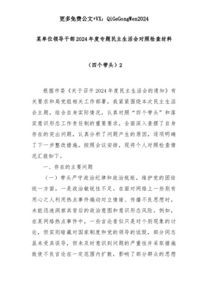 【七哥公文】2025年:某单位领导干部2024年度专题民主生活会对照检查材料(四个带头)2+更多免费公文+VX:QiGeGongWen2024+更多免费公文+VX:QiGeGongWen2024