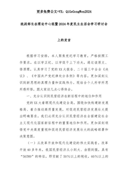 【七哥公文】2025年:统战部长在理论中心组暨2024年度民主生活会学习研讨会上的发言+更多免费公文+VX:QiGeGongWen2024+更多免费公文+VX:QiGeGongWen2024
