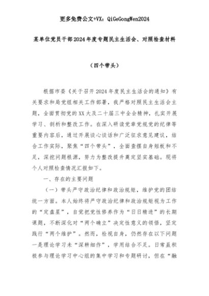 【七哥公文】2025年:某单位党员干部2024年度专题民主生活会、对照检查材料(四个带头)+更多免费公文+VX:QiGeGongWen2024+更多免费公文+VX:QiGeGongWen2024