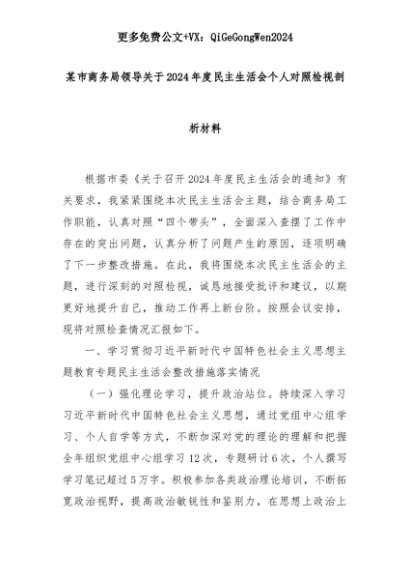 【七哥公文】2025年:某市商务局领导关于2024年度民主生活会个人对照检视剖析材料+更多免费公文+VX:QiGeGongWen2024+更多免费公文+VX:QiGeGongWen2024