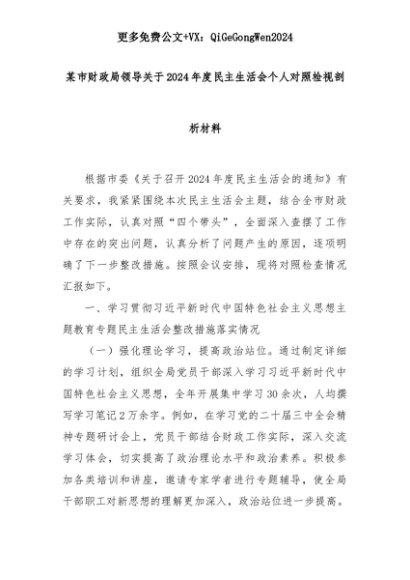 【七哥公文】2025年:某市财政局领导关于2024年度民主生活会个人对照检视剖析材料+更多免费公文+VX:QiGeGongWen2024+更多免费公文+VX:QiGeGongWen2024