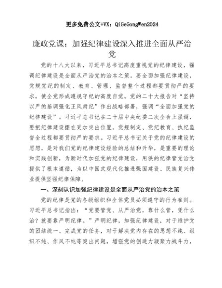 【七哥公文】2025年:廉政党课:加强纪律建设深入推进全面从严治党+更多免费公文+VX:QiGeGongWen2024+更多免费公文+VX:QiGeGongWen2024