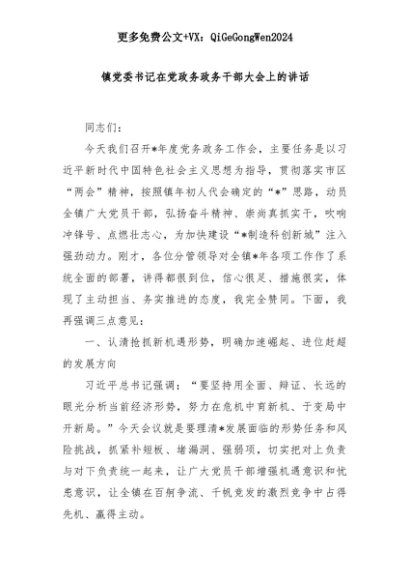 【七哥公文】2025年:镇党委书记在党政务政务干部大会上的讲话+更多免费公文+VX:QiGeGongWen2024+更多免费公文+VX:QiGeGongWen2024