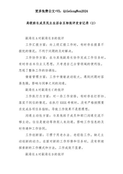 【七哥公文】2025年:局级班长成员民主生活会互相批评发言记录(2)+更多免费公文+VX:QiGeGongWen2024+更多免费公文+VX:QiGeGongWen2024