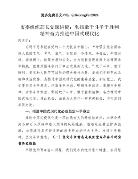 【七哥公文】2025年:市委组织部长党课讲稿:弘扬敢于斗争于胜利精神奋力推进中国式现代化+更多免费公文+VX:QiGeGongWen2024+更多免费公文+VX:QiGeGongWen2024