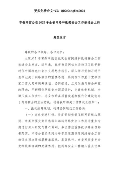 【七哥公文】2025年:市委网信办在2025年全省网络和数据安全工作推进会上的典型发言+更多免费公文+VX:QiGeGongWen2024+更多免费公文+VX:QiGeGongWen2024