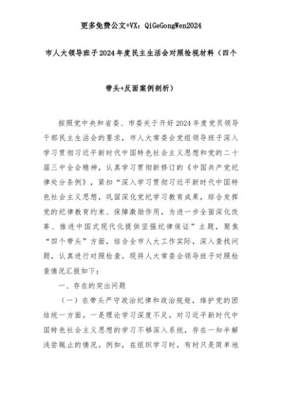 【七哥公文】2025年:市人大领导班子2024年度民主生活会对照检视材料(四个带头+反面案例剖析)+更多免费公文+VX:QiGeGongWen2024+更多免费公文+VX:QiGeGongWen2024