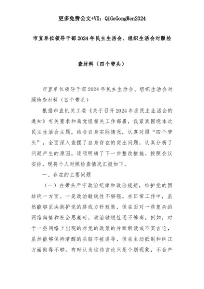 【七哥公文】2025年:市直单位领导干部2024年民主生活会、组织生活会对照检查材料(四个带头)+更多免费公文+VX:QiGeGongWen2024+更多免费公文+VX:QiGeGongWen2024