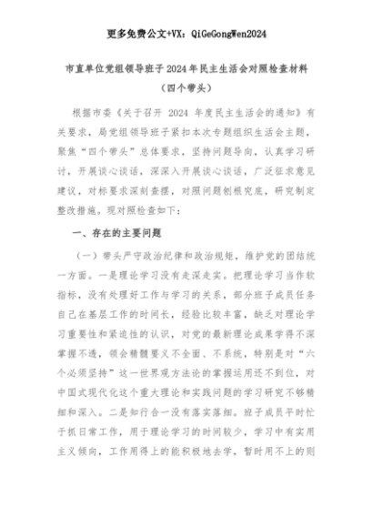 【七哥公文】2025年:市直单位党组领导班子2024年民主生活会对照检查材料(四个带头)+更多免费公文+VX:QiGeGongWen2024+更多免费公文+VX:QiGeGongWen2024