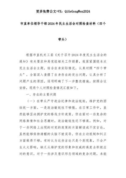 【七哥公文】2025年:市直单位领导干部2024年民主生活会对照检查材料(四个带头)+更多免费公文+VX:QiGeGongWen2024+更多免费公文+VX:QiGeGongWen2024