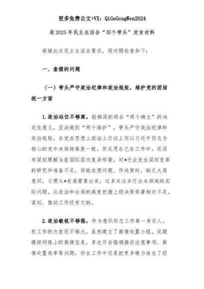 【七哥公文】2025年:局2025年民主生活会“四个带头”发言材料+更多免费公文+VX:QiGeGongWen2024+更多免费公文+VX:QiGeGongWen2024