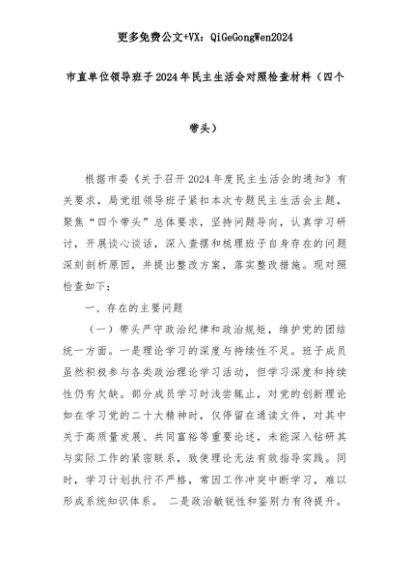 【七哥公文】2025年:市直单位领导班子2024年民主生活会对照检查材料(四个带头)+更多免费公文+VX:QiGeGongWen2024+更多免费公文+VX:QiGeGongWen2024