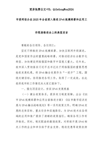 【七哥公文】2025年:市委网信办在2025年全省深入推进IPv6规模部署和应用工作现场推进会上的典型发言+更多免费公文+VX:QiGeGongWen2024+更多免费公文+VX:QiGeGongWen2024