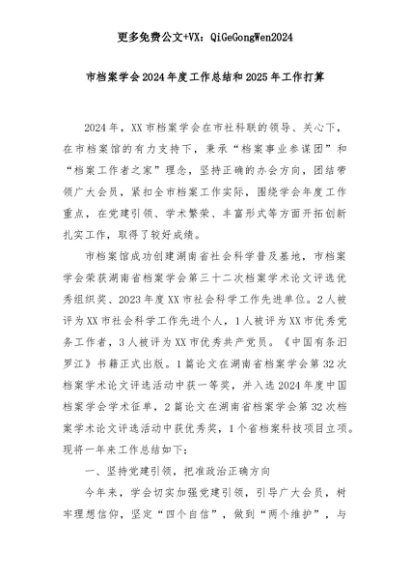 【七哥公文】2025年:市档案学会2024年度工作总结和2025年工作打算+更多免费公文+VX:QiGeGongWen2024+更多免费公文+VX:QiGeGongWen2024