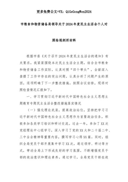 【七哥公文】2025年:市粮食和物资储备局领导关于2024年度民主生活会个人对照检视剖析材料+更多免费公文+VX:QiGeGongWen2024+更多免费公文+VX:QiGeGongWen2024