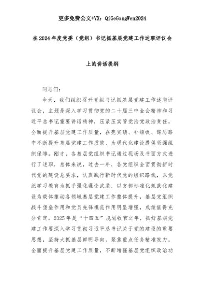 【七哥公文】2025年:在2024年度党委(党组)书记抓基层党建工作述职评议会上的讲话提纲+更多免费公文+VX:QiGeGongWen2024+更多免费公文+VX:QiGeGongWen2024