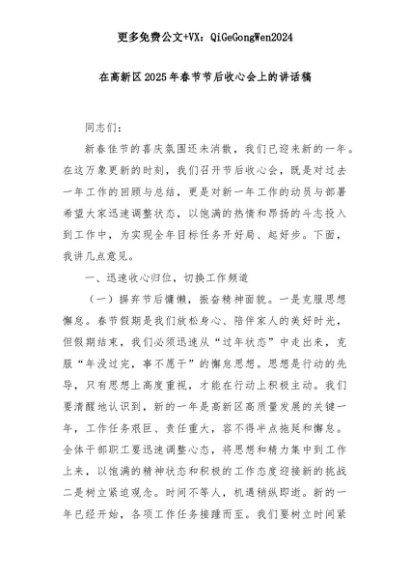 【七哥公文】2025年:在高新区2025年春节节后收心会上的讲话稿+更多免费公文+VX:QiGeGongWen2024+更多免费公文+VX:QiGeGongWen2024