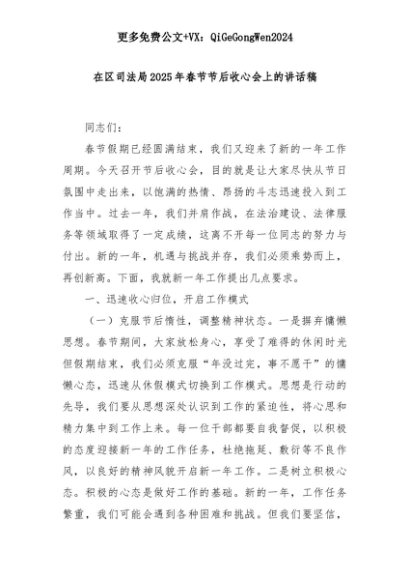【七哥公文】2025年:在区司法局2025年春节节后收心会上的讲话稿+更多免费公文+VX:QiGeGongWen2024+更多免费公文+VX:QiGeGongWen2024