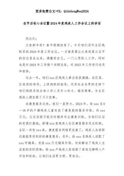 【七哥公文】2025年:在节后收心会议暨2024年度残疾人工作会议上的讲话+更多免费公文+VX:QiGeGongWen2024+更多免费公文+VX:QiGeGongWen2024