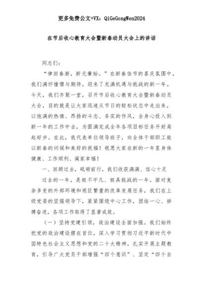 【七哥公文】2025年:在节后收心教育大会暨新春动员大会上的讲话+更多免费公文+VX:QiGeGongWen2024+更多免费公文+VX:QiGeGongWen2024