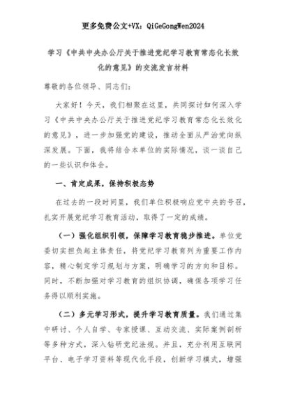 【七哥公文】2025年:学习《中共中央办公厅关于推进党纪学习教育常态化长效化的意见》的交流发言材料+更多免费公文+VX:QiGeGongWen2024+更多免费公文+VX:QiGeGongWen2024