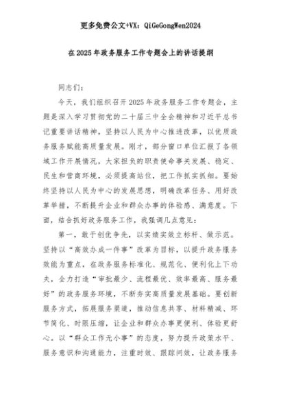 【七哥公文】2025年:在2025年政务服务工作专题会上的讲话提纲+更多免费公文+VX:QiGeGongWen2024+更多免费公文+VX:QiGeGongWen2024