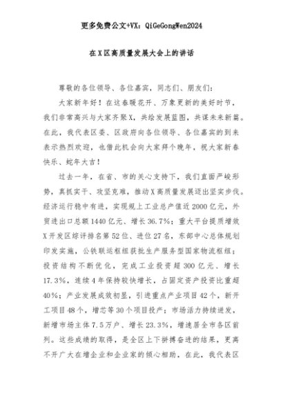 【七哥公文】2025年:在X区高质量发展大会上的讲话+更多免费公文+VX:QiGeGongWen2024+更多免费公文+VX:QiGeGongWen2024