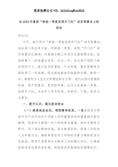 【七哥公文】2025年:在2025年集团“拼抢一季度实现开门红”动员部署会上的讲话+更多免费公文+VX:QiGeGongWen2024+更多免费公文+VX:QiGeGongWen2024