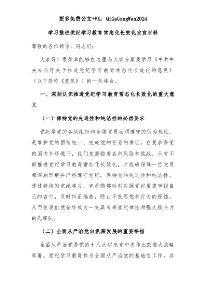 【七哥公文】2025年:学习推进党纪学习教育常态化长效化发言材料+更多免费公文+VX:QiGeGongWen2024+更多免费公文+VX:QiGeGongWen2024
