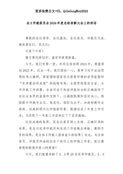 【七哥公文】2025年:在X仲裁委员会2024年度总结表彰大会上的讲话+更多免费公文+VX:QiGeGongWen2024+更多免费公文+VX:QiGeGongWen2024