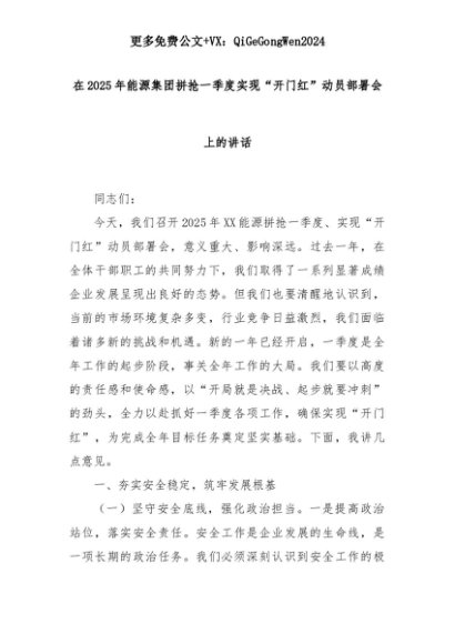 【七哥公文】2025年:在2025年能源集团拼抢一季度实现“开门红”动员部署会上的讲话+更多免费公文+VX:QiGeGongWen2024+更多免费公文+VX:QiGeGongWen2024